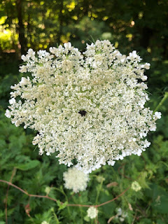 It's mid-July in Connecticut, when the upstairs is far too hot for sleeping comfortably, so there are happy sleep-overs in the few air conditioned spaces. The trees scream all afternoon with the insects keeping time with waves of heat. No baking. No way. The only cooking that happens happens on the stove top or grill. But the Queen Anne's Lace are brilliantly wrought, and compete with the ever-darkening, widening, multiplying bruises of hydrangeas. And our wine berries are ripe and this year, quite flavorful.